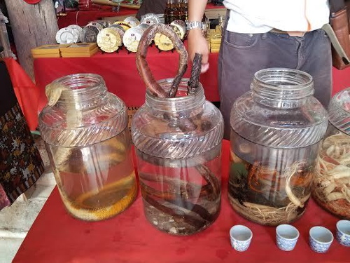 Lihat botolnya saja telah buat merinding. Di dalamnya ada rempah-rempah seperti gingseng, ular kobra serta kalajengking yang diawetkan, dengan air berwarna kekuningan. Jumlahnya juga bukan hanya satu dua, namun ada sangat banyak!